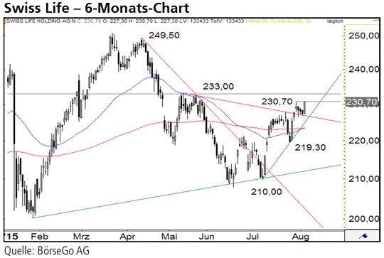 Ausblick: Innerhalb der langfristigen Aufwärtsbewegung könnten die Aktien in Kürze eine Trendbeschleunigung einleiten. Noch sind die Widerstände, die hierfür überwunden werden müssen, aber intakt. Die Long-Szenarien: Bereits heute dürfte eine Vorentscheidung fallen, ob eine mittelfristige Bodenbildung abgeschlossen werden kann. Denn überschreiten die Aktien das Zwischenhoch bei 230,70 CHF, wäre der kurzfristige Aufwärtstrend im Chart untermauert. Geht es im Anschluss auch über die etwas höher gelegene Barriere bei 233,00 CHF, dürften sich die Käufer so schnell nicht mehr aufhalten lassen. Erst ein weiteres Hoch bei 249,50 CHF dürfte dann einen Widerstand darstellen. Bis dahin hätten die Bullen also genügend Spielraum. Geht es sogar über das Allzeithoch bei 255,80 CHF, würde die Marke von 300,00 CHF wieder ein Thema werden. Das ist aber noch Zukunftsmusik. Die Short-Szenarien: Scheitern die Aktien an den benannten Widerständen bei 230,70 und 233,00 CHF, könnte die Bodenbildungsphase in die Verlängerung gehen. Unterhalb des Tiefs bei 219,30 CHF wäre der kurzfristige Aufwärtstrend formal beendet und ein Rücksetzer auf die Trendlinie seit Januar die wahrscheinlichste Variante. Erst wenn auch diese bricht, könnte es zu neuen Jahrestiefs unter 200,00 CHF kommen.