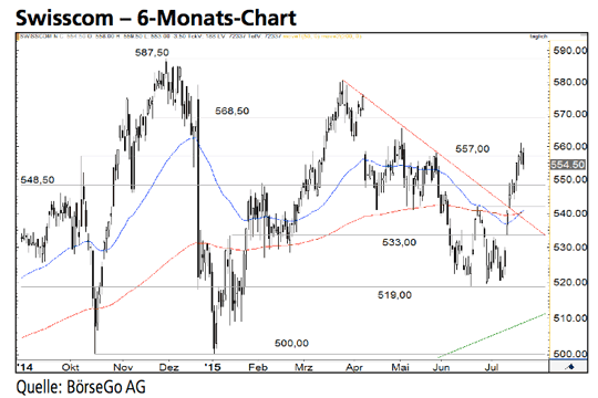 Ausblick: Die Bodenbildung an der 519,00 CHF-Marke kam zur rechten Zeit und hat die Aktien von Swisscom nicht nur vor weiteren drohenden Verlusten bewahrt, sondern den Aus - gangspunkt für einen bullishen Gegenschlag gebildet. Dieser könnte sich oberhalb von 557,00 CHF weiter fortsetzen. Die Long-Szenarien: Im gestrigen Handel entfernte sich der Wert von der 557,00 CHF-Marke nach unten und könnte zunächst nochmals bis an die Haltemarke bei 548,50 CHF zurücksetzen. Ausgehend von dieser Unterstützung dürften die Bullen jedoch den nächsten Ausbruchsversuch unternehmen und bei einem erfolgreichen Anstieg über die Hürde zu einem Angriff auf die 568,50 CHF-Marke ansetzen. An dieser Stelle könnte es zu einer weiteren kleinen Korrektur kommen, ehe die Aktien auch diesen Widerstand überschreiten und bis an das Rallyhoch bei 587,50 CHF haussieren könnten. Die Short-Szenarien: Ein Rücksetzer unter die 557,00 CHF-Marke würde dagegen nur für eine leichte Ausweitung der Gegenbewegung sorgen. Bereits an der markanten Unterstützung bei 542,00 CHF, auf Höhe der überschrittenen Abwärtstrendlinie, dürften die Bullen wieder aktiv werden und die Kaufwelle fortsetzen. Bricht der Wert dagegen unter die Marke ein, wäre die Erholung zunächst unterbrochen und eine mehrtägige Abwärtsbewegung die Folge. Erst an der soliden Unterstützung bei 519,00 CHF könnte ein solcher Einbruch gestoppt werden und die Aktien von Swisscom einen mittelfristigen Boden ausbilden.