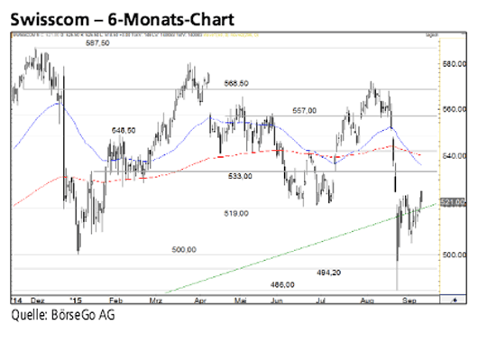 Ausblick: Der Einbruch der letzten Wochen lastet immer noch schwer auf den Aktien von Swisscom. Nach unserer Einschätzung dürfte der neu etablierte Abwärtstrend mit dem Ende der Erholung in eine neue Runde gehen.