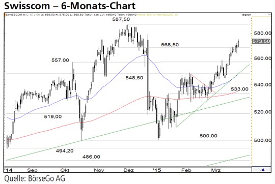 Ausblick: Die Aktien von Swisscom haben mit dem jüngsten Kaufimpuls den Abwärtstrend von Dezember 2014 neutralisiert. Aktuell nehmen sie Kurs auf das Rallyhoch. Die Long- Szenarien: Oberhalb der 557,00 CHF-Marke ist der Aufwärtstrend tonangebend und dürfte von der starken Käuferseite bis an das Hoch bei 587,50 CHF fortgeführt werden. An dieser Stelle sollte man sich auf eine Zwischenkorrektur einstellen, die durchaus bis 568,50 CHF zurückführen könnte. Anschliessend dürften die Bullen wieder aktiv werden und die Aktien schliesslich auch über das Verlaufshoch antreiben. Zugewinne bis 600,00 CHF und darüber auf mittlere Sicht bis 625,00 CHF wären dann möglich. Die Short-Szenarien: Im aktuell deutlich bullishen Umfeld wäre erst der Bruch der Unterstützung bei 557,00 CHF negativ zu werten. In diesem Fall wäre auch die kurzfristige Aufwärtstrendlinie unterschritten und damit ein kleines Verkaufssignal gebildet. Abgaben bis an die Haltemarke bei 533,00 CHF wären die Folge. An dieser Stelle könnte es jedoch zu einer weiteren Kaufwelle kommen. Ein Bruch der Marke würde dagegen Abgaben bis 519,00 CHF nach sich ziehen.