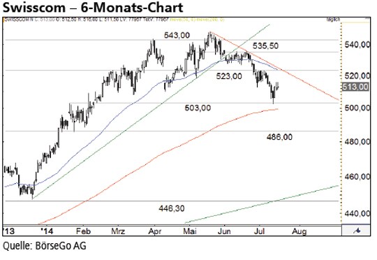 Ausblick: Mit dem Erreichen der Marke von 503,00 CHF wurden sämtliche Short-Ziele für die Aktien abgearbeitet. Im Idealfall für die Bullen startet der Wert jetzt wieder nach oben in Richtung der Jahreshochs durch. Stand jetzt befindet sich die Aufwärtsbewegung aber noch in einem sehr frühen Stadium. Die Long-Szenarien: Ein prozyklisches Kaufsignal liegt bislang noch nicht vor. Hierfür benötigen die Aktien Kurse über 523,00 CHF. Der Widerstand rührt von einem Schnittpunkt einer Horizontalen und des kurzfristigen Abwärtstrends her. Oberhalb von 519,00 CHF würde sich das Chartbild deutlich aufhellen. Weitere Kursgewinne auf 535,50 CHF wären dann wahrscheinlich. Eine Rückeroberung dieser Marke dürfte endgültig den Weg auf 543,00 CHF frei machen. Die Short-Szenarien: Bereits ein Rückfall unter die Unterstützung bei 503,00 CHF würde wohl sämtliche Bullenträume erst einmal zerstören. Der dann bestätigte kurzfristige Abwärtstrend könnte die Aktien bis an die Unterstützung bei 486,00 CHF drücken. Spätestens dort wäre der Wert aber reif für eine starke Gegenbewegung.