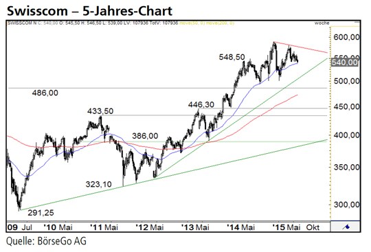 Ausblick: Formationstechnisch lässt sich der Kursverlauf seit März in ein absteigendes Dreieck fassen, das mit dem gestrigen Kursrutsch aktiviert wurde. Gelingt nun kein schneller Konter seitens der Käufer, könnte sich die kurzfristige Abwärtsbewegung verschärfen. Die Short-Szenarien: Nachdem die potenzielle Wendemarke bei 543,00 CHF aufgeweicht worden ist, besteht um 535,50 CHF für die Bullen die nächste Chance, den Kurs aufzufangen. Scheitert auch dieses Vorhaben, werden Verluste auf die Horizontale bei 523,00 CHF wahrscheinlich. Selbst ein Rückgang auf 503,00 CHF wäre im langfristigen Kontext noch vertretbar, ohne die übergeordnete Rally zu gefährden. Wird dagegen auch die Marke von 500,00 CHF unterboten, steht die Aufwärtsbewegung seit dem Jahr 2009 auf der Kippe. Die Long-Szenarien: Eine schnelle Rückeroberung der kurzfristigen Schlüsselmarke bei 543,00 CHF könnte die gestrigen Verluste als einmaligen Ausrutscher entlarven. Steigen die Aktien anschliessend auch über das Hoch bei 558,00 CHF an, wäre der Abwärtstrend seit dem Märzhoch bei 580,50 CHF beendet. Ein langfristiges Kaufsignal in Richtung 626,00 CHF entstünde aber erst über 587,50 CHF.