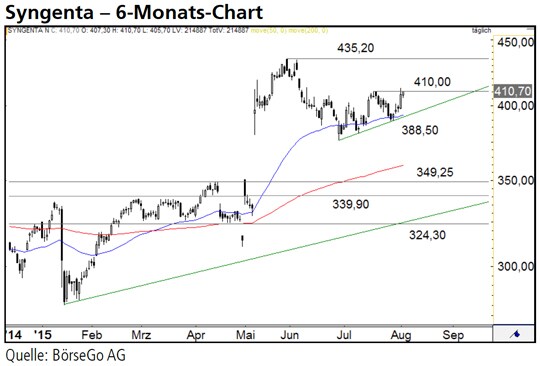 Ausblick: Gestern haben die Käufer, wenn auch nur leicht, bereits einen Schlusskurs über dem Widerstand bei 410,00 CHF bewirkt. Ein weiteres höheres Hoch im Chart würde die laufende Aufwärtsbewegung untermauern. Die Long-Szenarien: Können die Aktien im Laufe der Woche neben dem Widerstand bei 410,00 CHF auch das Hoch bei 412,70 CHF überwinden, würde sich das Chartbild deutlich aufhellen. Das Momentum läge dann klar auf Seiten der Käufer, zudem könnte eine Bodenbildung im Chart als abgeschlossen gewertet werden. Daraus lässt sich in einem ersten Schritt Potenzial an das Hoch aus dem März 2013 bei 416,00 CHF ableiten. Fällt auch dieser Widerstand, kann nur mehr das Allzeithoch bei 435,20 CHF die Bullenherde stoppen. Darüber wäre der Weg auf 450,00 CHF frei. Die Short-Szenarien: Solange im Kurs ansteigende Tiefpunkte zu verzeichnen sind, ist der kurzfristige Aufwärtstrend intakt. Ein Bruch des Tiefs bei 388,50 CHF würde ein erstes bearishes Signal mit sich bringen. Wird in der Folge auch das Tief bei 376,00 CHF unterboten, wären die Verkäufer am Zug. Sie dürften den Wert wieder auf das langfristige Unterstützungsniveau bei 349,25 CHF drücken.
