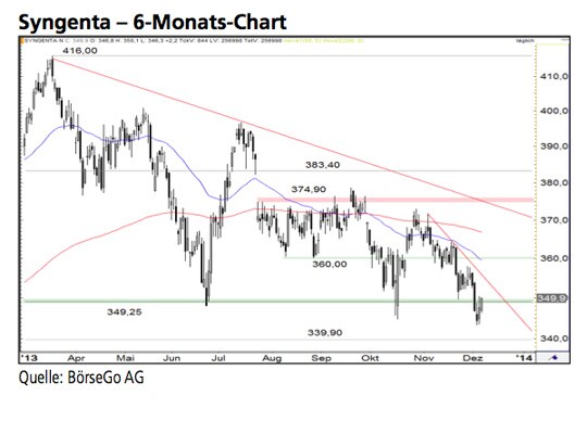 Ausblick: Aktuell vollziehen die Aktien von Syngenta einen Rücklauf über die 349,25 CHF-Marke. Ausgehend von der Bar- riere bei 352,00 CHF dürfte sich der Abwärtstrend des Wertes aus unserer Sicht in den kommenden Tagen fortsetzen. Die Short-Szenarien: Bei 352,00 CHF dürfte eine weitere Verkaufswelle einsetzen und bis an die Unterstützung bei 339,90 CHF führen. Darunter wären Abgaben bis 335,00 CHF zu erwarten, ehe sich die Abwärtsbewegung der Aktien von Syngenta auf mittlere Sicht bis an die Haltemarke bei 324,30 CHF ausdeh- nen könnte. Sollte auch dieser Bereich durchbrochen werden, könnte es sogar zu einem Ausverkauf bis 312,60 CHF kom- men. Die Long-Szenarien: Ein Anstieg über 352,00 CHF würde dagegen nur eine leichte Erholung bis in den Bereich des kurzfristigen Widerstands bei 360,00 CHF auslösen können. Bereits auf diesem Niveau könnte aufkommender Abgabedruck zu einem erneuten Kursrutsch führen. Sollte die 360,00 CHF- Marke dagegen überwunden werden, wäre die Abwärtstrend- linie auf Höhe der Hürde bei 374,90 CHF das nächste Ziel.
