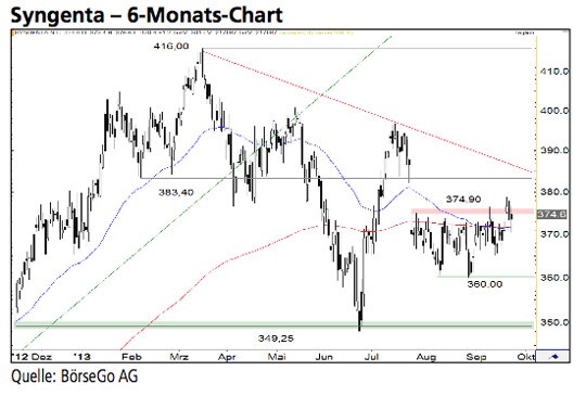 Aktuell versuchen die Bullen die Aktien von Syngenta über die 374,90 CHF-Marke anzutreiben. Damit würden sie eine Bodenbildungsphase erfolgreich abschliessen. Die Long-Szenarien: Können die Aktien auf Tagesschlusskursbasis über 374,90 CHF verbleiben, wäre ein kleines bullishes Signal aktiv und mit einem Anstieg an den zentralen Widerstand bei 383,40 CHF zu rechnen. Sollte diese Barriere ebenfalls über- wunden werden, wäre ein Kaufsignal gebildet, in dessen Folge der Wert bis 400,00 CHF haussieren könnte. Wird auch diese Hürde überschritten, wären bereits Zugewinne bis an das Allzeithoch bei 416,00 CHF wahrscheinlich. Die Short-Szenarien: Ein Scheitern an der 374,60 CHF-Marke hätte dagegen eine weitere Korrektur bis 367,00 CHF zur Folge. Von dort aus könnte es zu einem erneuten Ausbruchsversuch kommen. Wird die Marke dagegen unterschritten, sind Abgaben bis 360,00 CHF zu erwarten. Kann diese wichtige Unterstützung nicht zu einer Stabilisierung genutzt werden, droht bereits ein Ausverkauf bis 349,25 CHF und darunter bis 340,00 CHF.