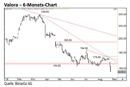 Ausblick: Der Abwärtstrend der Aktien von Valora ist weiter intakt und dürfte auch in den nächsten Wochen den Kurs- verlauf bestimmen. Die Short-Szenarien: Unterhalb des Wider- standes bei 164,00 CHF dürfte sich der Ausverkauf bis 150,00 CHF fortsetzen. Von dort aus könnte es zu einem bearishen Rücklauf an die Ausbruchsmarke bei 164,00 CHF kommen, von der der Wert jedoch nach unten abprallen dürfte. Ein Rücksetzer unter 150,00 CHF würde entsprechend weitere Verluste bis 132,80 CHF auslösen. Kann auch diese entschei- dende Unterstützung nicht verteidigt werden, droht bereits der mittelfristige Rückfall auf 120,00 CHF. Die Long-Szenarien: Erst ein nachhaltiger Anstieg über 164,00 CHF könnte aus un- serer Sicht derzeit für etwas Entspannung sorgen. In diesem Fall könnte zunächst eine Erholung bis 175,00 CHF führen. Ob dieser massive Widerstand in Richtung 184,50 CHF durchbro- chen werden kann, ist aktuell jedoch mehr als fraglich.