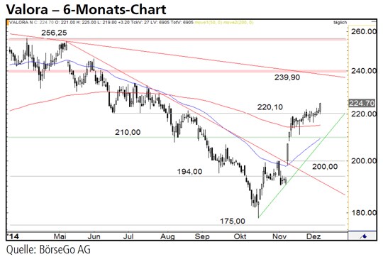Ausblick: Die Aktien von Valora machten in den letzten Wochen einiges an Boden gut und stemmten sich erfolgreich gegen den mittelfristigen Abwärtstrend. Der Anstieg vom Freitag untermauert dies. Die Long-Szenarien: Der Ausbruch über 220,10 CHF hat ein weiteres Kaufsignal aktiviert und dürfte jetzt zu einem Anstieg bis 230,00 CHF führen. Oberhalb dieser Hürde stünde der Widerstand bei 239,90 CHF auf der Agenda. An dieser Marke könnte es zu einer ersten mehrtägigen Korrektur kommen. Sollte dieser Widerstand im weiteren Verlauf durchbrochen werden, könnte sich der Aufwärtstrend bis 246,00 CHF fortsetzen. Darüber käme es zu einem Angriff auf die starke Kurshürde bei 256,25 CHF. Die Short-Szenarien: Fallen die Aktien dagegen wieder unter die 220,10 CHF-Marke zurück, könnte ausgehend von 215,00 CHF ein weiterer Aufwärtsimpuls einsetzen. Darunter würde die wichtige Unterstützung bei 210,00 CHF angelaufen. Allerdings wäre erst der Bruch dieser Marke bearish zu werten und würde einen mittelfristigen Kursrutsch bis 200,00 und 194,00 CHF auslösen.