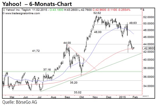 Ausblick: Die Aktien von Yahoo! nähern sich aktuell dem Unterstützungsbereich bei 41,72 USD und drohen damit unter die mittelfristige Aufwärtstrendlinie zu fallen. Dies würde für weitere Verluste sorgen. Die Short-Szenarien: Kann das Hoch der jüngsten Erholung bei 45,25 USD nicht direkt durchbrochen werden, dürften die Bären den Verkaufsdruck erhöhen und damit einen Bruch der 41,72 USD-Marke auslösen. Zugleich würde damit auch die Aufwärtstrendlinie unterschritten. In der Folge könnte es zu einer starken Verkaufswelle bis 37,16 USD kommen. Erst auf diesem Niveau hätten die Bullen wieder eine Chance auf eine mittelfristige Bodenbildung. Die Long-Szenarien: Steigt der Wert dagegen über 45,25 USD an, wartet bereits bei 48,00 USD der nächste signifikante Widerstand, der einen erneuten Ausverkauf auslösen könnte. Aktuell würde erst ein nachhaltiger Anstieg über den Widerstandsbereich um 50,00 USD für ein Ende der Korrektur sprechen. Dieses Kaufsignal könnte den Wert bis 52,62 und 55,00 USD katapultieren.