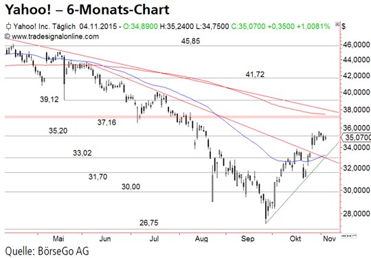 Rückblick: Das Jahr 2015 begann für die Aktien von Yahoo! nach dem Rücksetzer unter die Unterstützung bei 45,85 USD mit einer Korrektur, die in den folgenden Monaten zu einem dynamischen Abwärtstrend auswuchs.