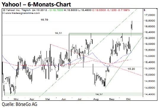 Insbesondere im Hinblick auf den aktuell korrigierenden US-Gesamtmarkt ist der Anstieg der Aktien von Yahoo! beeindruckend. Ein weiteres Kaufsignal könnte bereits kurz bevor stehen. Die Long-Szenarien: Sollte es der Käuferseite gelingen, den Widerstand bei 16,79 USD ebenfalls zu durch- brechen, wäre ein Kaufsignal aktiv, welches man entsprechend mit einem Longengagement handeln könnte. Im Anschluss an diese Ausbruchsbewegung dürften die Aktien zunächst bis 17,00 USD und darüber bis 17,50 USD ansteigen. An dieser Stelle könnte es zu einer leichten Gegenbewegung kommen. Würde allerdings auch die Barriere bei 17,50 USD nachhaltig überschritten, könnte eine mittelfristige Kaufwelle bis 19,00 USD führen. Die Short-Szenarien: Scheitert der Wert dagegen an der Hürde bei 16,79 USD, könnte eine Korrektur bis 16,31 USD einsetzen. Von dort aus dürfte jedoch bereits die nächste Ausbruchsbewegung beginnen. Würde diese Unterstützung hingegen unterschritten, wäre eine stärkere Abwärtsbewegung bis 15,74 USD zu erwarten. Doch erst der Bruch dieser starken Kreuzunterstützung hätte ein kurzfristiges Verkaufssignal zur Folge. In diesem Fall kann es zu Verlusten bis 15,20 USD und darunter bis zur zentralen Unterstützungszone von 14,37 USD bis 14,59 USD kommen.