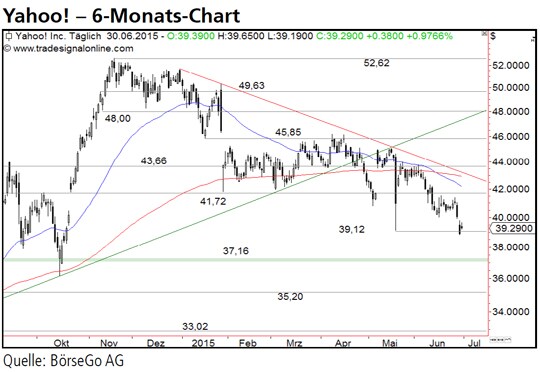 Rückblick: Im November 2014 endete bei den Aktien von Yahoo! ein steiler Aufwärtstrend, der nach einem neuen Verlaufshoch bei 52,62 USD zunächst in eine Konsolidierung überging.