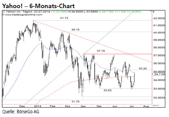 Ausblick: Aktuell haben die Bären weiter die besseren Karten und dürften in Kürze zu einem Angriff auf die wichtigen Unterstützungen ausholen. Die Short-Szenarien: Solange es der Käuferseite nicht gelingt, den Wert über den Widerstand bei 35,20 USD anzutreiben, sollte sich die jüngste Schwächephase der Aktien mit einem Unterschreiten der Haltemarke bei 33,02 USD fortsetzen. Anschliessend dürfte eine Abwärtsbewegung bis 31,70 USD führen. Kann diese Unterstützung ebenfalls durchbrochen werden, käme es zu einem Ausverkauf bis zur 30,00 USD-Marke. Dort stünden die Chancen auf eine Bodenbildung wieder günstiger. Allerdings hätte ein Unterschreiten der Marke ein mittelfristiges Verkaufssignal und einen Einbruch bis 26,75 USD zur Folge. Die Long-Szenarien: Ein Anstieg über 34,50 USD würde zwar eine Erholung bis 36,00 USD einleiten. Ein echter Befreiungsschlag wäre jedoch erst mit einem Ausbruch über diesen Kreuzwiderstand verbunden. Sollte dies den Bullen gelingen, hätten sie ein Kaufsignal etabliert, in dessen Folge die Aktien von Yahoo! bis 37,16 USD und darüber bereits bis 39,00 USD ansteigen könnten.