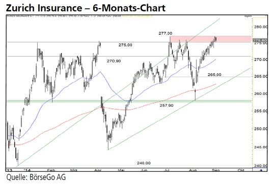 Erst im April dieses Jahres gelang es den Bullen, diesen Einbruch zu stoppen und mit der Rückeroberung der 257,90 CHF-Marke an den vorherigen Aufwärtstrend anzuknüpfen. Im Rahmen der darauffolgenden Kaufwelle stieg der Wert ein weiteres Mal an die 275,00 CHF-Marke, konnte diese zunächst jedoch nicht nachhaltig überwinden. Ausgehend von einem neuen Jahreshoch bei 277,00 CHF bildete der Wert ein bearishes ansteigendes Dreieck aus, das im Juli nach unten durchbrochen wurde. Es folgte ein Ausverkauf, der diesmal allerdings auf einem höheren Niveau, der Unterstützung bei 257,90 CHF, beendet wurde. Seit der Verteidigung dieser Haltemarke konnten die Bullen eine steile Kaufwelle ausbilden, die die negativen Vorgaben des Kurseinbruchs im Juli wieder neutralisierte. Aktuell erreichen die Aktien von Zurich Insurance erneut den Widerstandsbereich von 275,00 bis 277,00 CHF.