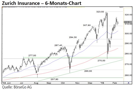 Rückblick: Mit dem Ausbruch über den langfristigen Widerstand bei 275,00 CHF kam es bei den Aktien von Zurich Insurance im September des vergangenen Jahres zu einem übergeordneten Kaufsignal, das zur Fortsetzung des mittelfristigen Aufwärtstrends führte.