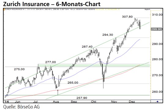 Rückblick: Im Laufe ihres mehrjährigen Aufwärtstrends stiegen die Aktien von Zurich Insurance an das Hoch des Jahres 2011 bei 275,00 CHF an, das schliesslich im September dieses Jahres nach oben durchbrochen wurde.