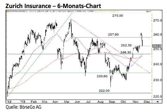 Das Kaufsignal, das die Bullen bei den Aktien von Zurich Insurance im Oktober gebildet hatten, ist weiterhin intakt. Die laufende Gegenbewegung ist aus unserer Sicht lediglich auf kurzfristige Gewinnmitnahmen zurückzuführen. Die Long-Szenarien: Die aktuelle Korrektur könnte sich insbesondere zeitlich weiter ausdehnen und die kommenden Tage andauern. Ausgehend von der wichtigen Unterstützung bei 252,30 CHF dürfte sich die Rally jedoch fortsetzen. Sollte in der Folge ein weiterer Anstieg über die Hürde bei 257,90 CHF gelingen, würde das Zwischenhoch bei 261,20 CHF ebenfalls überschritten. Damit hätte der Wert direktes Aufwärtspotenzial bis an den massiven Widerstandsbereich von 270,90 CHF bis 275,00 CHF. Sollte diese Barriere ebenfalls durchbrochen werden, wäre bereits ein mittelfristiges Kaufsignal mit einem ersten Ziel bei 290,00 CHF gebildet. Die Short-Szenarien: Das aktuell klar bullishe Chartbild würde erst durch einen Bruch der Unterstützung bei 246,30 CHF eingetrübt. In diesem Fall könnte es zu einem tiefen Rücklauf an die gebrochene Abwärtstrendlinie auf Höhe von 239,90 CHF kommen. An dieser Stelle sollte sich der Aufwärtstrend jedoch fortsetzen können.