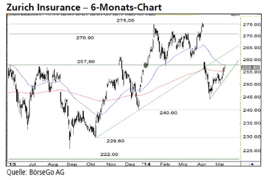 Rückblick: Die Aktien von Zurich Insurance beendeten eine steile Rally, die im November 2012 begonnen hatte, im Mai 2013 mit einem kurzfristigen Doppelhoch bei 270,90 CHF.