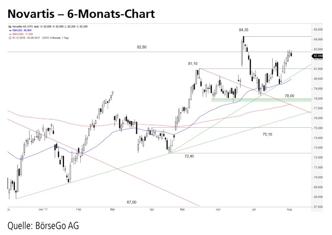 Rückblick: Seit Dezember 2016 stiegen die Aktien von Novartis in einer soliden Aufwärtsbewegung an den zentralen Widerstand bei 82,80 CHF, der im Juni dieses Jahres bereits kurzzeitig durchbrochen wurde.