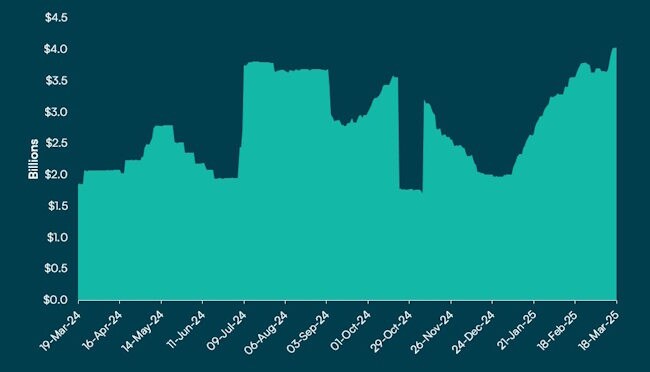 Gold-backed RWAs: A Stable Pillar Gold-backed tokens offer investors a secure hedge against inflation while maintaining liquidity within the crypto ecosystem. As illustrated in the chart below, gold-backed token TVL indicates strong demand for onchain access to gold, with the metric doubling from sub-$2 billion in late December 2024 to over $4 billion currently.