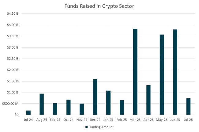 Figure 1: Monthly Crypto Funding Raised excluding IPOs (Jul 2024 - Jul 2025)