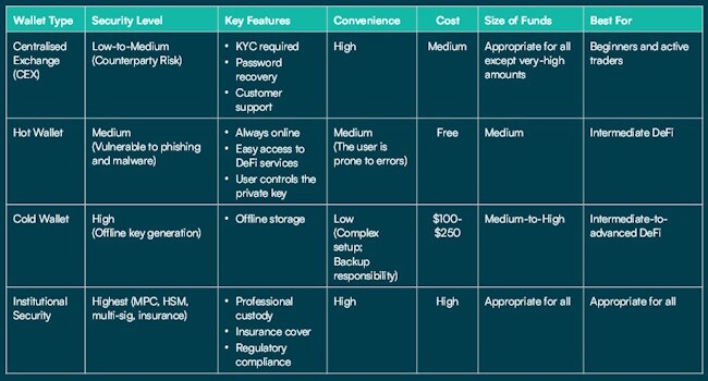 The table below provides an illustrative overview - as of the day of publication of this article - of the key differences between the main custody options and shows how each one fits into an overall crypto-security plan.