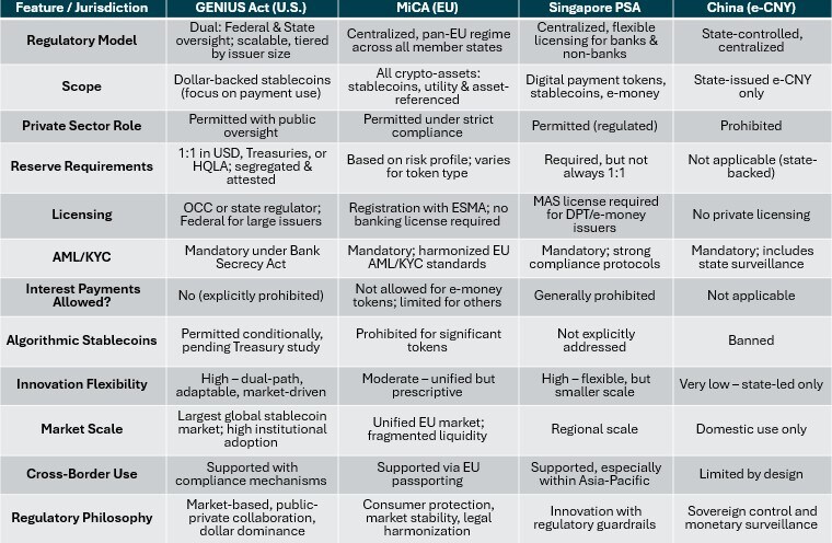 Globally, the GENIUS Act introduces a scalable and adaptable framework that distinguishes itself through its dual-path model and market-based incentives. Compared to the European Union’s Markets in Crypto-Assets Regulation (MiCA), which applies a centralized and prescriptive approach, the U.S. system prioritizes institutional scalability and public-private collaboration. Singapore’s Payment Services Act (PSA) similarly supports innovation through flexible licensing, though at a smaller market scale.