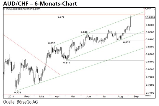 Zu Beginn dieses Jahres wurde mit 0,778 CHF ein neues Ausverkaufstief gebildet, das bislang jedoch den Endpunkt der Baisse darstellt. Denn in diesem Bereich kamen die Käufer wieder in den Wert zurück und konnten mit der Ausbildung einer bullishen Schulter-Kopf- Schulter-Formation eine Trendwende einleiten. Im März brach AUD/CHF zudem über die übergeordnete Abwärtstrendlinie und den Widerstand bei 0,802 CHF aus und setzte den Anstieg innerhalb eines stabilen Aufwärtstrendkanals fort. Im Juli kam diese Kaufwelle im Bereich des Widerstands bei 0,850 CHF vorübergehend ins Stocken und der Wert setzte an die Unterstützung bei 0,832 CHF zurück. Hier gelang den Käufern ein erfolgreicher Konter, der das Devisenpaar über die Hürden bei 0,848 und 0,850 CHF ausbrechen liess. Das damit gebildete Kaufsignal sorgte für eine Beschleunigung des Aufwärtstrends, was im gestrigen Handel zu einer dynamischen Kaufwelle führte: Mit einer langen, weissen Kerze stieg AUD/CHF direkt an die Oberseite des Trendkanals und damit in die Nähe des langfristigen Widerstands bei 0,875 CHF an.