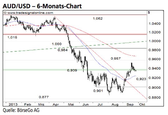 Die erfolgreiche Bodenbildung der letzten Wochen hat bei Währungspaar AUD/USD zu einem vorübergehenden Ende des Ausverkaufs geführt. Von einer Trendwende zu Gunsten der Bullen zu sprechen, scheint nach unserer Auffassung jedoch noch verfrüht. Die Short-Szenarien: Kurzfristig ist davon auszugehen, dass AUD/USD ausgehend vom Unterstützungsbereich bei 0,939 USD bis an den Widerstand bei 0,957 USD ansteigen dürfte. An dieser Hürde könnten jedoch bereits wieder die Bären in das Geschehen eingreifen und den Wert zur 0,939 USD-Marke drücken. Ein anschliessender Bruch der Haltemarke bei 0,923 USD würde das Paar wieder in den Seit- wärtsmarkt der letzten Wochen zurückfallen lassen. Abgaben bis zur 0,901 USD-Marke und darunter bis zum Tief bei 0,884 USD wären die Folge. Kann dieser Preisbereich nicht zu einer Bodenbildung genutzt werden, würde ein langfristiges Verkaufssignal mit einem ersten Ziel bei 0,863 USD gebildet. Die Long-Szenarien: Sollte es den Bullen dagegen gelingen, den starken Widerstand bei 0,957 USD nachhaltig zu durchbrechen, würde sich die Erholung zunächst bis 0,984 USD fortsetzen können. Auch auf diesem Niveau muss jederzeit mit der Wiederaufnahme der übergeordneten Baisse gerechnet werden. Erst ein Anstieg über diese Barriere wäre derzeit bullish zu werten und würde eine Kaufwelle bis 1,015 USD nach sich ziehen.
