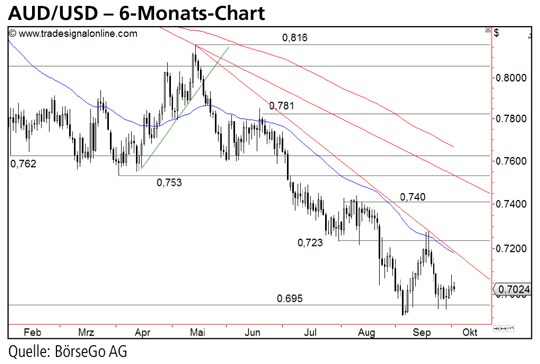 Ausblick: Die Bullen arbeiten bei AUD/USD aktuell an einer Bodenbildung. Eine mittelfristige Trendwende ist in greifbare Nähe gerückt. Die Long-Szenarien: Kurzfristig dürfte das Paar jetzt in Richtung der kurzfristigen Abwärtstrendlinie auf Höhe von 0,720 USD ansteigen. An dieser Stelle sollte man sich auf Gegenwehr seitens der Verkäufer einstellen, die eine Korrektur des Anstiegs auslösen dürften. Kann AUD/USD in der Folge jedoch über die 0,720 USD-Marke ausbrechen, wäre der erste Schritt für eine Bodenbildung getan. Ein Ausbruch über die Barriere bei 0,723 USD würde sie erfolgreich abschliessen und zu einem Aufwärtsimpuls bis an den Widerstand bei 0,740 USD führen. Nach einer leichten Korrektur könnten die Bullen auch diese Hürde überschreiten und das Währungspaar mittelfristig bis an den Bereich um 0,760 USD antreiben. Die Short-Szenarien: Sollte AUD/USD dagegen auf dem aktuellen Niveau Schwäche zeigen und an die Unterstützung bei 0,695 USD zurückfallen, würde die Gefahr weiterer Verkaufswellen akut steigen. Denn bei einem weiteren Ausverkauf unter die Haltemarke wäre ein langfristiges bearishes Signal generiert. In diesem Fall müsste man damit rechnen, dass das Paar auf Sicht der kommenden Monate bis 0,680 USD einbrechen dürfte. Selbst ein Kursrutsch bis 0,650 USD könnte in diesem Fall nicht mehr ausgeschlossen werden.