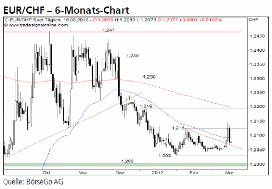 Ausblick: Sollte es den Käufern gelingen, den Widerstand bei 1,215 CHF nachhaltig zu überschreiten, stünde eine Aufwertung des Euro gegenüber dem Franken an. Die Long-Szenarien: Ein Ausbruch über 1,215 CHF würde zunächst zu einem Anstieg bis 1,219 CHF führen. Oberhalb dieser kleineren Hürde könnte es jedoch bereits zu einer Aufwärtswelle bis 1,230 CHF kommen. Auf mittlere Sicht wäre bei einem Anstieg über diese Barriere mit einer Hausse bis 1,239 CHF und letztlich bis zur zentralen Hürde bei 1,247 CHF zu rechnen. Spätestens auf diesem Niveau wäre zwar wiederum von starkem Abgabedruck auszugehen, doch würde ein Anstieg über die Marke Potential bis 1,275 CHF eröffnen. Die Short-Szenarien: Kurzfristige Rücksetzer an das gestrige Tagestief bei 1,207 CHF sollten aufgrund der gestiegenen Volatilität des Währungspaares eingeplant werden, wären für die aktuell laufende Erholung jedoch aus unserer Sicht unbedenklich. Erst ein Rückfall unter diese Unterstützung dürfte Abgaben bis 1,203 CHF auslösen.