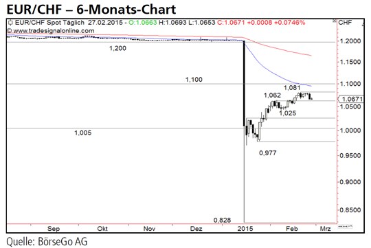 Rückblick: Nach der Aufhebung des Mindestkurses von 1,200 CHF durch die SNB brach das Devisenpaar EUR/CHF im Januar in einem steilen Ausverkauf bis 0,828 CHF ein.