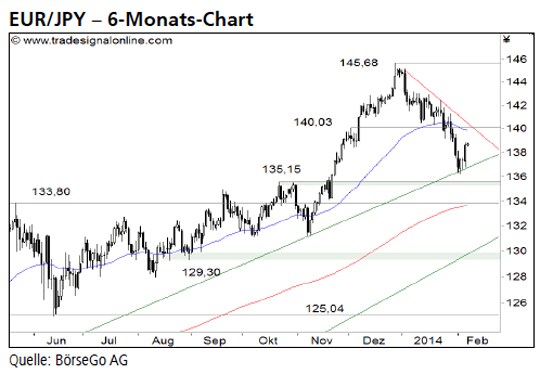 Ausblick: Aktuell befindet sich das Devisenpaar an einem entscheidenden Kurslevel. Ausgehend vom Unterstützungsbereich um 135,15 JPY wäre jetzt ein deutlicher Anstieg möglich, der sogar zur Fortsetzung des Aufwärtstrends führen könnte. Die Long-Szenarien: Zunächst sollte EUR/JPY vom aktuellen Niveau an den starken Widerstand bei 140,03 JPY steigen. Dort kann mit einer weiteren kurzfristigen Abwärtsbewegung gerechnet werden. Im Anschluss dürfte allerdings aufkommender Kaufdruck zu einem Ausbruch über die Hürde führen. In diesem Fall wäre die Korrekturphase überwunden und ein Kaufimpuls bis 145,68 JPY die Folge. Kann auch das Verlaufshoch durchbrochen werden, stünde ein mehrwöchiger Anstieg bis 151,00 JPY auf der Agenda. Die Short-Szenarien: Ein Rücksetzer unter die Aufwärtstrendlinie könnte dagegen bereits an der wichtigen Unterstützung bei 135,15 JPY von den Bullen aufgefangen werden und sich eine leichte Aufwärtsbewegung anschliessen. Würde diese Haltemarke jedoch nachhaltig unterschritten, wäre ein Verkaufssignal aktiviert. In der Folge dürfte EUR/JPY stark einbrechen und bis 129,30 JPY zurückfallen.