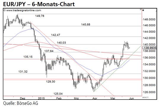 Rückblick: Nach dem Ausbruch über eine mittelfristige Aufwärtstrendlinie im November 2014 stieg das Devisenpaar EUR/JPY auch über das Jahreshoch bei 145,68 JPY an und markierte mit 149,78 JPY ein neues Verlaufshoch.