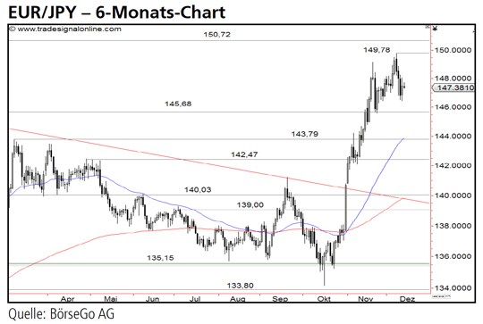Rückblick: Das Devisenpaar EUR/JPY brach Ende November über das Hoch des Jahres 2013 aus und krönte damit einen steilen Aufwärtstrend mit einem mittelfristigen Kaufsignal.