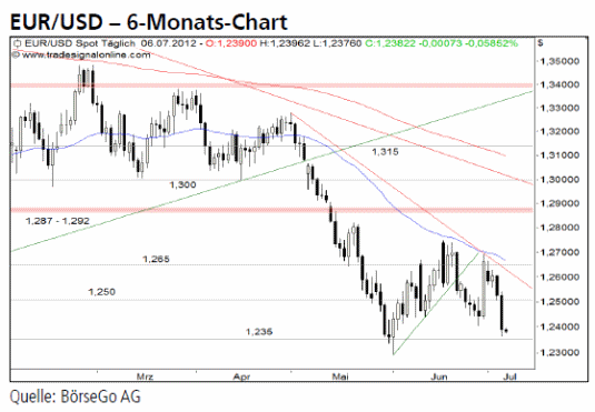 Ausblick: Sollte EUR/USD auch deutlich unter 1,235 USD zurückfallen, wäre dies nach unserer Auffassung ein klares Zeichen für eine Fortsetzung des übergeordneten Abwärtstrends. Die Short-Szenarien: Fällt das Paar unter 1,235 USD zurück, sind weitere Abgaben bis 1,228 USD zu erwarten. Darunter kann es zu einem Ausverkauf bis 1,215 und 1,200 USD kommen. Selbst eine Ausweitung bis 1,185 USD wäre in diesem Fall möglich. Die Long-Szenarien: Erst ein deutlicher Anstieg über den Widerstand bei 1,250 USD könnte einen solchen Kursrutsch zumindest zeitlich hinauszögern. In der Folge dürfte EUR/USD bis 1,265 und darüber auf 1,275 USD ansteigen. Auf diesem Niveau könnte es jedoch zu einer Fortsetzung der Abwärtsbewegung seit Mai diesen Jahres kommen. Ein signifikanter Ausbruch über diese starke Kursbarriere würde dagegen für ein Ende des Ausverkaufs und eine Erholung bis 1,292 USD sprechen.