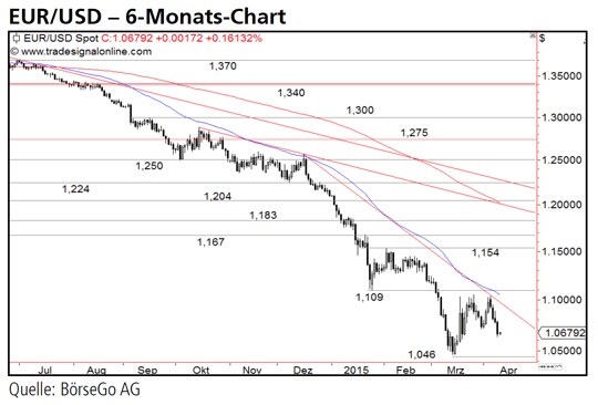 Rückblick: Mit dem Bruch der Unterstützung bei 1,340 USD verabschiedete sich das Währungspaar EUR/USD im August 2014 aus einer mittelfristigen Seitwärtsbewegung und ging in einen dynamischen Abwärtstrend über, der bislang andauert.