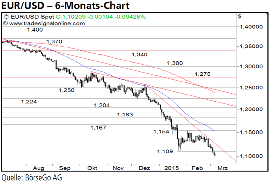 Ausblick: Der gestrige Einbruch hat bei EUR/USD ein weiteres Verkaufssignal gebildet. Ein Ende der Baisse ist nicht absehbar. Die Short-Szenarien: Solange der Wert unterhalb der 1,109 USD-Marke notiert, ist mit einer Ausweitung der laufenden Verkaufswelle zu rechnen, die das Devisenpaar zunächst bis 1,080 USD drücken dürfte. Sollte auch diese Marke unterschritten werden, würde die Unterstützung bei 1,050 USD angesteuert. An dieser Stelle könnte es zu einer ersten leichten Erholung kommen. Fällt die 1,050 USD-Marke dagegen ebenfalls dem Ansturm der Bären zum Opfer, muss mit einem mittelfristigen Einbruch bis 1,000 USD gerechnet werden.