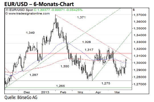 Der Ausverkauf seit Anfang Mai hat bearishe Spuren hinterlassen und weite Teile der vorherigen Rally wieder zunichte gemacht. Dennoch könnten die Bullen jetzt mit einer erfolgreichen Bodenbildung ein Achtungszeichen setzen. Die Long-Szenarien: Kann das Paar über dem Widerstand bei 1,300 USD verbleiben, wäre eine kurzfristige Bodenbildung abgeschlossen und ein Anstieg bis 1,317 USD und darüber gegebenenfalls bis 1,324 USD die Folge. Zu einem wirklichen Befreiungsschlag seitens der Bullen käme es jedoch erst, sollte der Wert im Anschluss auch über die Barriere bei 1,328 USD ausbrechen. In der Folge dieses Kaufsignals könnte EUR/USD direkt bis 1,340 USD haussieren. Die Short-Szenarien: Scheitern die Käufer dagegen und setzt der Wert wieder unter die 1,300 USD-Marke zurück, dürfte das Währungspaar bis 1,287 USD zurückfallen. Würde diese Marke nicht zu einer weiteren Erholung genutzt, sollte ein Kursrutsch bis 1,275 USD erfolgen. Auf diesem Niveau könnte eine mittelfristige Bodenbildung einsetzen. Ein Ausverkauf unter die Unterstützung würde dagegen ein Verkaufssignal auslösen. In diesem Fall dürfte EUR/USD bis 1,265 USD zurückfallen. Weitere Verluste bis 1,250 USD könnten dann nicht mehr ausgeschlossen werden.