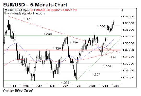 Das Kaufsignal, das mit dem Ausbruch aus dem Seitwärtsmarkt der letzten Monate generiert wurde, entfaltet seine Wirkung. Ein Anstieg an das Jahreshoch dürfte aus unserer Sicht in Kürze folgen. Die Long-Szenarien: Solange der Wert oberhalb von 1,356 USD notiert, dürfte sich der Anstieg bis an den starken Widerstand bei 1,371 USD fortsetzen. Sollte auch diese Marke überwunden werden, könnte die Rally von EUR/USD bis 1,386 USD führen. Selbst die mittelfristige Ausweitung des Aufwärtstrends bis 1,395 USD wäre in diesem Fall denkbar. Die Short-Szenarien: Ein Rücksetzer unter 1,356 USD würde zunächst nur eine kurzfristige Gegenbewegung bis in den Bereich um 1,340 USD auslösen. An dieser Unterstützung könnte sich der Wert bereits wieder stabilisieren und mit neuem Schwung bis 1,371 USD haussieren. Sollte es dagegen zu einem Bruch der 1,340 USD-Marke kommen, würde dies zum Auftakt für eine grössere Korrektur werden: In der Folge wäre mit einer mehrtägigen Abwärtsbewegung bis 1,328 USD zu rechnen.