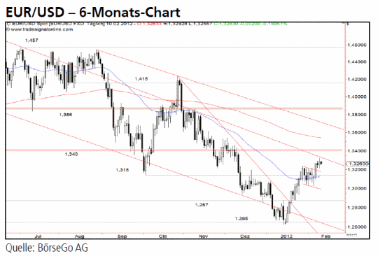 Ausblick: Die kurzfristige Aufwärtstrendphase des Euro ist weiterhin intakt. Sie darf jedoch aus unserer Sicht bis dato nicht darüber hinwegtäuschen, dass sich das Währungspaar weiter in einem übergeordneten Abwärtstrend befindet. Die Long-Szenarien: Kann sich der Euro oberhalb der wichtigen 1,325 USD-Marke etablieren, ist ein weiterer Anstieg bis 1,340 USD zu erwarten. Hier, spätestens jedoch bei 1,347 USD sollte man sich nach unserer Auffassung auf eine deutlichere Korrektur einstellen. Erst ein nachhaltiger Ausbruch über 1,340 USD würde derzeit ein bullishes Signal liefern, welches man entsprechend „long“ handeln könnte. In der Folge dürfte der Wert bis 1,365 USD und gegebenenfalls bis 1,386 USD ansteigen. Die Short-Szenarien: Setzt der Euro hingegen unter 1,315 USD zurück, wäre der Aufwärtstrend kurzfristig unterbrochen. Eine Korrektur bis 1,300 USD dürfte folgen. Kann der Wert diese Marke jedoch nicht verteidigen, sind weitere Verluste bis 1,287 USD zu erwarten. Unterhalb dieser Unterstützung droht bereits ein Rückfall in den Abwärtstrend. Abgaben bis 1,265 USD könnten die unmittelbare Folge sein.