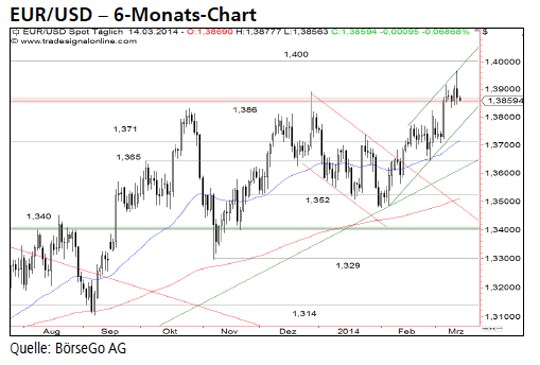 Rückblick: Das Währungspaar EUR/USD stieg bis Ende 2013 an den zentralen Widerstand bei 1,386 USD an, setzte von dort jedoch an die Unterstützung bei 1,352 USD zurück.