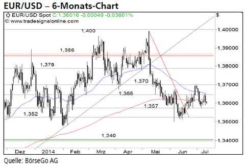 Ausblick: Wenngleich die bisherigen Korrekturtiefs noch nicht erreicht oder unterschritten sind, droht die seit Juni laufende Erholungsbewegung zu verpuffen. Ehemalige Unterstützungen, die mittlerweile zu Widerständen umfunktioniert wurden, stellen grosse Hindernisse dar. Die Short-Szenarien: Für die Bullen gilt es, das Währungspaar über der Unterstützung bei 1,357 USD zu halten. Misslingt dieses Vorhaben, dürfte das Währungspaar auf 1,352 USD ausverkauft werden. Diese Marke bildete den letzten Strohhalm aus Sicht der Bullen. Bleibt der Verkaufsdruck hoch und unterschreitet EUR/USD die Marke von 1,352 USD signifikant, wäre die Abwärtsbewegung seit dem Hoch im Mai noch einmal bestätigt. Schnelle Kursabgaben auf 1,340 USD dürften die Folge sein. Dort ist das Währungspaar auch im langfristigen Bild sehr gut unterstützt. Die Long-Szenarien: Erobert EUR/USD hingegen die Marke von 1,365 USD zurück, könnte dies kurzfristig für Entspannung sorgen. Ein erneuter Anlauf auf den Widerstand bei 1,370 USD wäre in diesem Fall denkbar. Doch würde sich das Chartbild erst über dieser runden Marke wieder deutlicher verbessern. Aus Bullensicht könnte man das Kursmuster seit Mai dieses Jahres oberhalb von 1,370 USD als mittelfristige Bodenformation werten. Diese könnte das Währungspaar zunächst wieder in Richtung 1,378 USD und später 1,386 USD heben. Vorerst geben bei EUR/USD aber klar die Bären den Ton an.