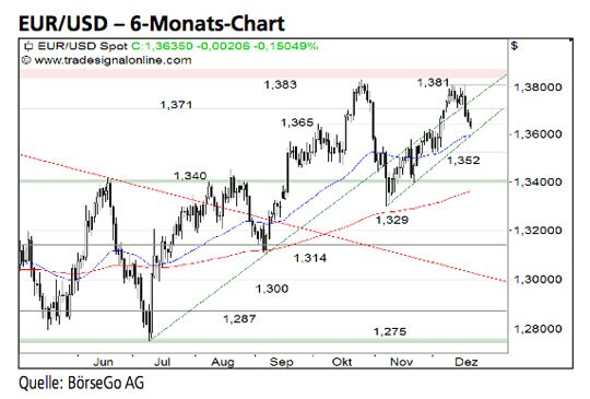 Mit dem Kursrücksetzer in dieser Woche wurde auf Tagesbasis ein Doppelhoch als Umkehrformation aktiviert. Zudem hat EUR/USD den bereits zurückeroberten Aufwärtstrend wieder nach unten verlassen. Weitere Kursverluste sind daher wahrscheinlich. Im negativsten Szenario für die Bullen könnte sogar die komplette Erholung seit November wieder negiert werden. Die Short-Szenarien: EUR/USD notiert aktuell bereits unterhalb der Unterstützung bei 1,365 USD. Nur wenn das Währungspaar diese Marke schnell wieder zurückerobert, könnten die Bullen noch einmal eine Kurserholung in Richtung 1,371 USD einleiten. Gibt EUR/USD aber die Unterstützung bei 1,365 USD auf, dürfte die Kreuzunterstützung aus dem Aufwärtstrend seit November und dem EMA50 bei 1,359 USD einem Belastungstest unterzogen werden. Kann auch diese Marke nicht verteidigt werden, drohen weitere Kursverluste bis auf die Unterstützung bei 1,352 USD. Die Long-Szenarien: Nur eine schnelle Rückeroberung der jetzt zum Widerstand umfunktionierten Marke bei 1,371 USD würde den Bullen helfen. EUR/USD könnte in diesem Fall wieder die Hochs bei 1,381 USD ansteuern. Allerdings dürfte ein Anstieg über das Jahreshoch bei 1,383 USD in den wenigen verbleibenden Tagen des Jahres 2013 schwer fallen.