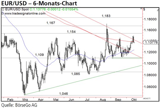 Ausblick: Das Währungspaar EUR/USD steht kurz vor einem weitreichenden Kaufsignal. Der Ausbruch über die Abwärtstrendlinie ist hierfür allerdings Bedingung. Die Long-Szenarien: Sollte es den Bullen gelingen, die Trendlinie zu überwinden und den Wert in der Folge auch über die Widerstandsmarke bei 1,154 USD anzutreiben, wäre das Kaufsignal aktiviert. Nach einem dynamischen Anstieg bis 1,167 USD könnte es zwar zu einer kurzen Korrektur kommen, dennoch dürfte sich der Aufwärtsimpuls anschliessend mit einem Ausbruch über die Hürden bei 1,167 und 1,171 USD fortsetzen. Auf mittlere Sicht könnte EUR/USD in diesem Fall bis an die 1,183 USD-Marke und darüber bereits bis an die langfristige Kurshürde bei 1,204 USD haussieren. Ein Ausbruch über diesen Widerstand würde die Baisse bei EUR/USD beenden und zu einem Anstieg bis 1,224 USD führen. Die Short-Szenarien: Scheitert der laufende Ausbruchsversuch dagegen, wäre zunächst mit einer kurzen Gegenbewegung bis 1,130 USD zu rechnen. Von dort aus könnte der nächste Anstieg in Richtung der 1,154 USD-Marke erfolgen. Sollte das Paar jedoch unter 1,130 USD zurückfallen, würde die wichtige Unterstützung bei 1,106 USD von den Bären angegriffen werden. Diese sollte von der Käuferseite verteidigt werden und sich eine weitere Aufwärtsbewegung anschliessen. Ein Ausverkauf unter die Marke hätte dagegen ein Verkaufssignal mit einem ersten Ziel bei 1,085 USD zur Folge.