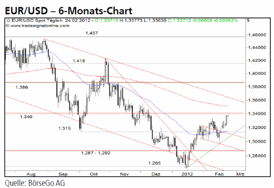 Rückblick: Der Euro konnte den Ausverkauf der Vormonate Mitte Januar an der Unterstützung bei 1,265 USD vorläufig beenden und befindet sich seither in einer Erholung.
