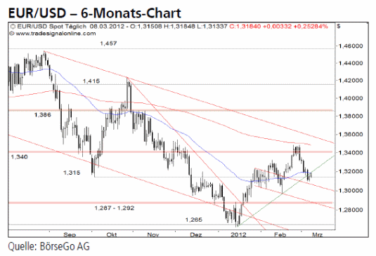 Ausblick: Der starke Ausverkauf seit dem 29. Februar belastet den Euro und sollte unserer Einschätzung nach zu einer tendenziellen Fortsetzung der schwachen Preisentwicklung führen. Zwischengeschaltete Erholungsversuche sollten hierbei spätestens im Bereich von 1,330 USD enden. Die Short- Szenarien: Einsetzende Aufwärtsreaktionen bis in den Bereich von 1,320 bis 1,330 USD könnte man dementsprechend prozyklisch „short“ handeln. Eine anschliessende Wiederaufnahme der Abwärtsbewegung bis 1,300 und dem folgend bis 1,287 USD erscheint aussichtsreich. Kann sich der Euro bei 1,287 USD nicht stabilisieren, droht in Folge dessen ein Test des Bereichs um 1,265 USD. Die Long-Szenarien: Entfalten sich die möglichen Aufwärtsreaktionen jedoch als Startrampe für einen deutlichen Anstieg über 1,330 USD, sollten unmittelbar einsetzende Preissteigerungen bis 1,348 und darüber bis 1,355 USD erwartet werden. Oberhalb von 1,355 USD stünde die seit dem Hoch vom August 2011 ausgebildete Abwärtstrendlinie zur Debatte. Preise darüber könnten eine mittelfristige Trendwende bis hin zur Marke von 1,415 USD initiieren.