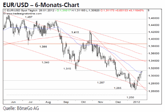 Ausblick: Der jüngste Aufwärtsimpuls fand durch die gestrige Notenbanksitzung der FED seine Fortsetzung und führte den Euro bis nahe zum ersten Widerstandsbereich von 1,315 USD heran. Die Short-Szenarien: Das weitere Aufwärtspotenzial scheint nach der rund 500 Pip-Bewegung begrenzt und somit könnte man aus unserer Sicht bereits damit beginnen, erste Shortengagements im Bereich von 1,315 USD aufzubauen. Spätestens zwischen 1,315 und 1,325 USD sollte der Euro wieder zur Schwäche neigen und bei Preisen unterhalb von 1,287 USD weiter bis 1,262 USD und darunter bis 1,250 USD fallen. Die Long-Szenarien: Eine weitere Aufwertung bei Preisen über 1,330 USD sollte andererseits den Euro weiter stärken können und Zugewinne bis zum Niveau von 1,343 USD in Aussicht stellen. Oberhalb davon wäre das Niveau von 1,362 USD als nächster Zielbereich zu benennen.