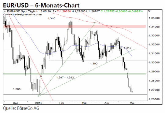 Ausblick: Das Währungspaar bleibt weiterhin enorm unter Abgabedruck. Den Käufern müsste nun eine sofortige Bodenbildung gelingen, um ein weiteres Verkauffssignal zu verhindern. Die Short-Szenarien: Verbleibt EUR/USD unterhalb des kurzfristigen Widerstands bei 1,280 USD, dürfte die Marke bei 1,265 USD erneut attackiert werden. Sollte es den Verkäufern gelingen, diese Unterstützung auf Tagesschlusskursbasis zu durchbrechen, wäre ein Verkaufssignal aktiv, welches man entsprechend „short“ handeln könnte. In der Folge dürfte EUR/USD zunächst bis 1,250 und darunter bis 1,235 USD einbrechen. Auf mittlere Sicht wären bei einem Unterschreiten dieser Haltemarke bereits Abgaben bis 1,187 USD, dem Tief des Jahres 2011, zu erwarten. Die Long-Szenarien: Ein Anstieg über 1,280 USD würde hingegen nur zu einer kurzfristigen Erholung führen können. Denn bereits bei 1,287 und 1,292 USD warten massive Hürden, an denen mit einer weiteren Verkaufswelle und einem Rückfall bis an das gestrige Tief zu rechnen ist. Erst ein nachhaltiger Ausbruch über 1,292 USD könnte derzeit für Entspannung sorgen. In diesem Fall dürfte das Devisenpaar bis an die ehemalige Unterstützungsmarke bei 1,300 USD ansteigen. Ob diese starke Kursbarriere jedoch ohne eine vorherige ausgedehnte Bodenbildungsphase überwunden werden kann, ist nach unserer Einschätzung aktuell mehr als fraglich.