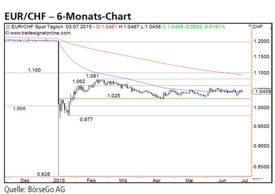Die Short-Szenarien: Ein Scheitern an der 1,054 CHF-Marke hätte dagegen einen erneuten Test der zentralen Haltemarke bei 1,025 CHF zur Folge. Wird diese durchbrochen, wäre die Chance auf eine Fortsetzung der Erholung seit Januar vorerst vergeben. Ein Ausverkauf bis 1,005 CHF und darunter bereits bis 0,977 CHF wäre die Folge.