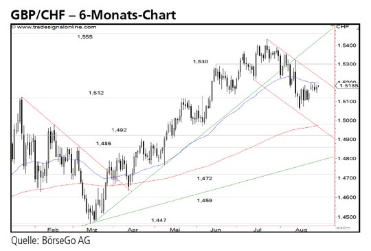Bei 1,447 CHF setzte in der Folge eine Erholung ein, die sich mit dem Bruch der oberen Begrenzungslinie der Flaggenformation zu einem neuerlichen Aufwärtstrend entwickelte. Dieser führte das Devisenpaar in den folgenden Monaten über die Hürden bei 1,492 und 1,512 CHF. Angetrieben von diesen Kaufsignalen stieg der Wert bis Ende Juli bereits an den Widerstand bei 1,555 CHF an. Kurz vor einem langfristigen Kaufsignal ebbte der Kaufimpuls jedoch ab und das Paar setzte unter die Unterstützung bei 1,530 CHF zurück. Dieses kleine Verkaufssignal sorgte für den Beginn einer Korrrekturphase, die GBP/CHF Anfang dieses Monats an die wichtige Haltemarke bei 1,512 CHF drückte. Dort kamen die Bullen jedoch in den vergangenen Tagen wieder in den Wert zurück und konnten eine Erholung auslösen. Diese trifft aktuell auf den Widerstand bei 1,520 CHF.